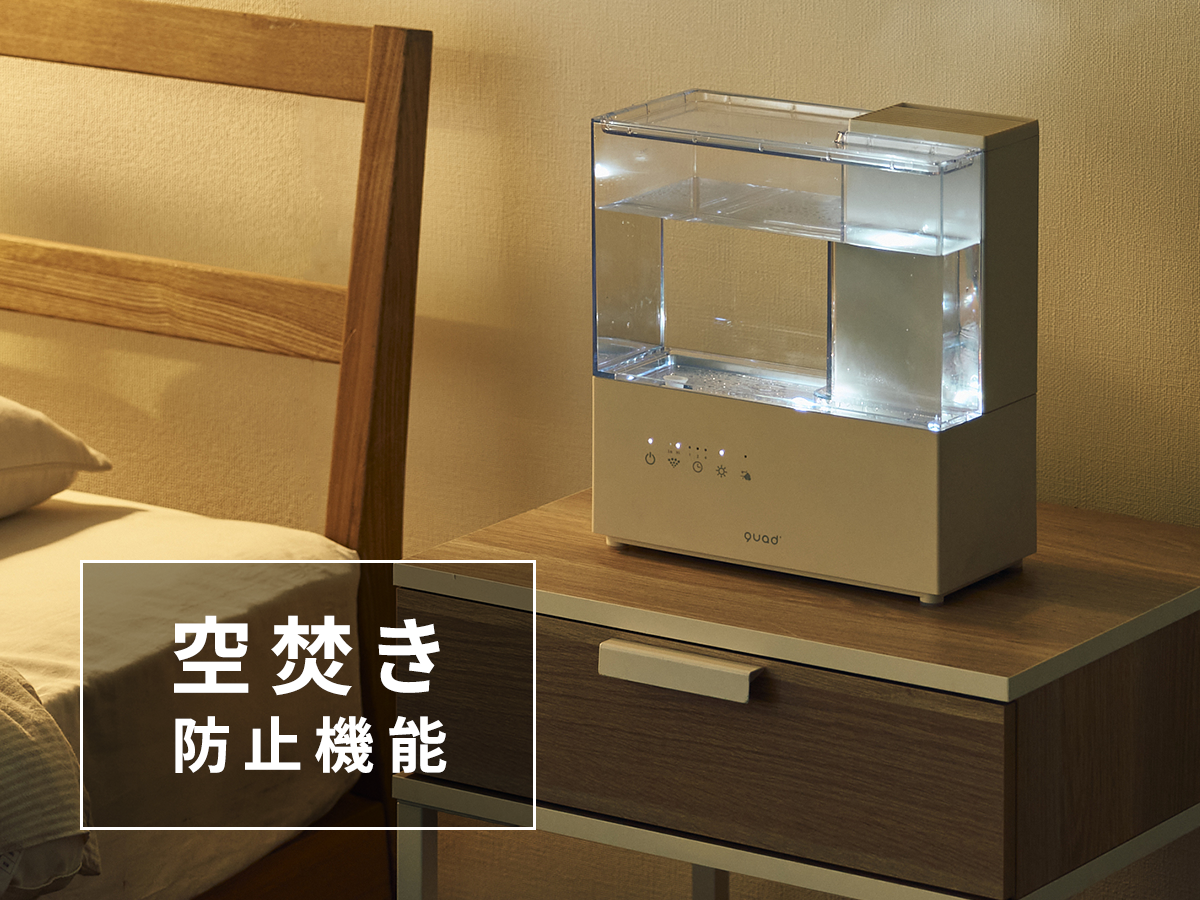 水タンクの水がなくなると、自動で電源OFFになる空焚き防止機能付き。万が一水を入れ忘れた際にも安心です。
