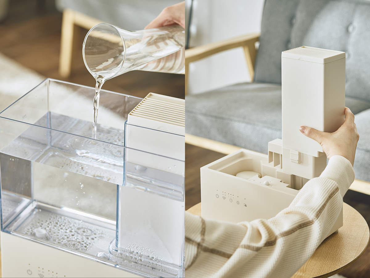 タンクを取り外さずに蓋を外して直接水を入れることができるのでラクに給水できます。(容量約3L) 一般的な加湿器では内部の洗浄が難しい場合も多く、カビや細菌が繁殖する恐れがあります。丸洗い可能でお手入れがしやすく、常に清潔な状態を保てます。