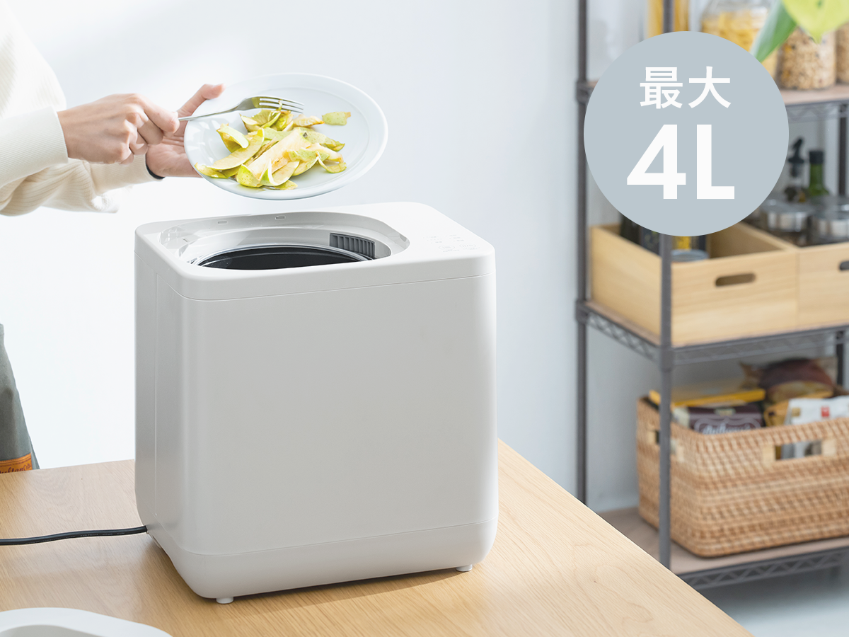 1回につき最大4L、およそ6人家族1日分のゴミを投入可能。最短2時間、平均約4〜6時間で処理することができます。生ごみの回収頻度が少ない都市部やマンションに最適です。