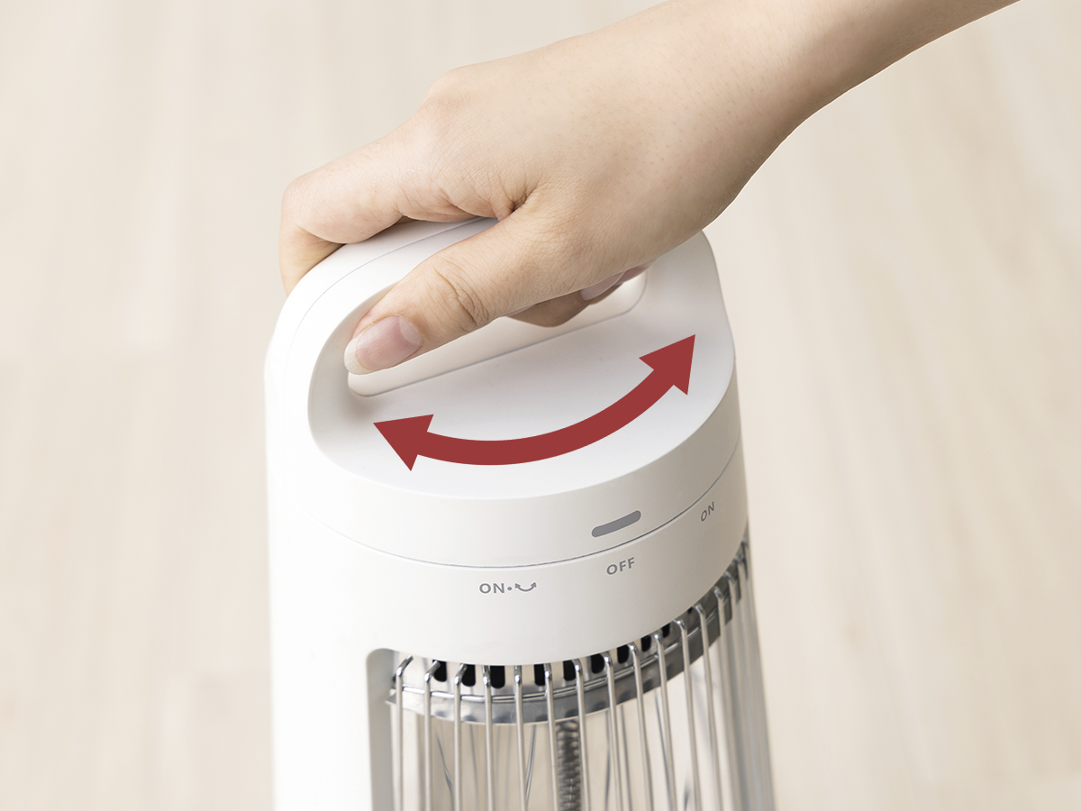 本体上部の取っ手部分を回転させることで、電源のON/OFF、首振りの操作が可能です。また取っ手は持ちやすい形状のため、持ち運びも簡単です。