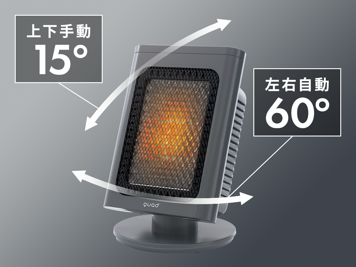 左右60°の自動首振り、上下は15°の範囲で手動で調整ができるので、足元から体の上部まで広範囲をあたためることができます。