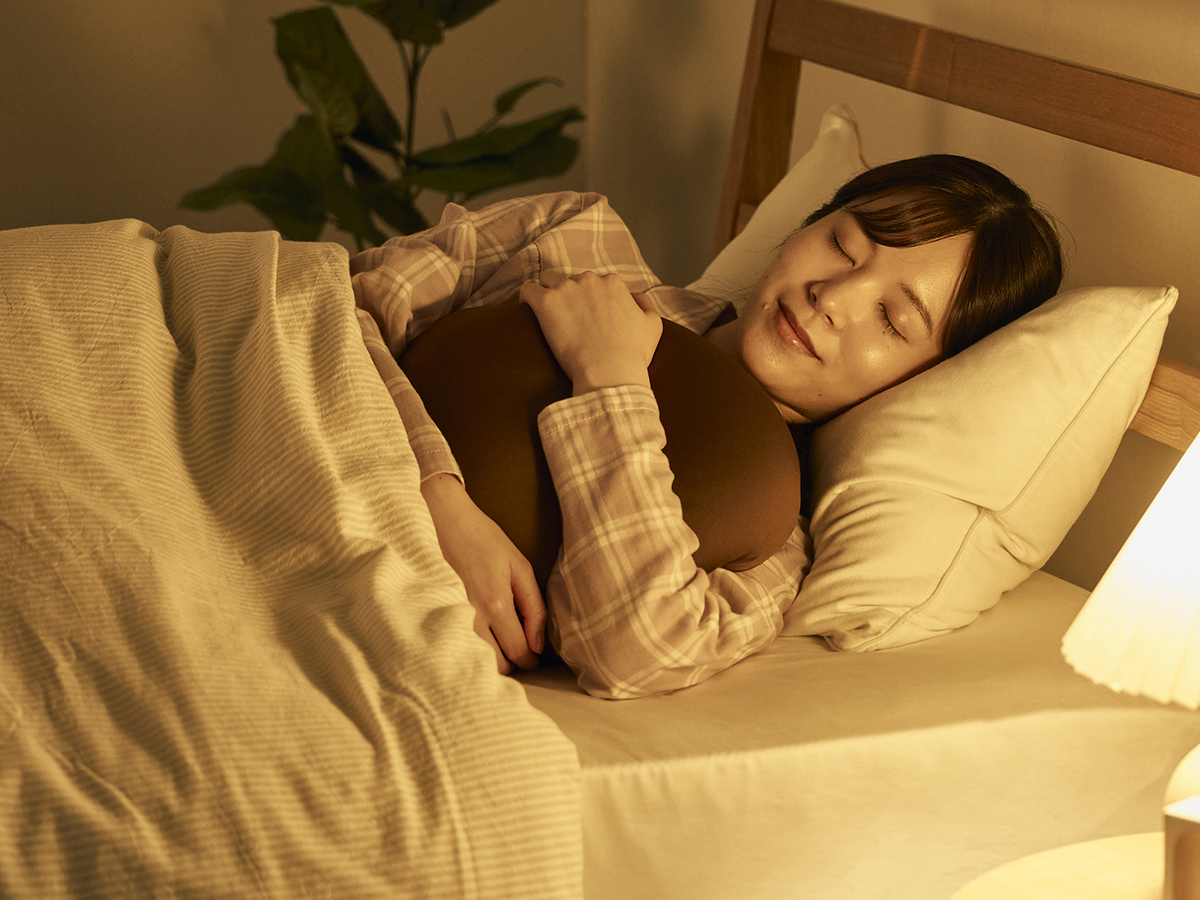 中材のビーズが体の形にやさしくフィットし、じんわりとした温かさをキープ。抱えるだけで心地よいぬくもりを感じられます。